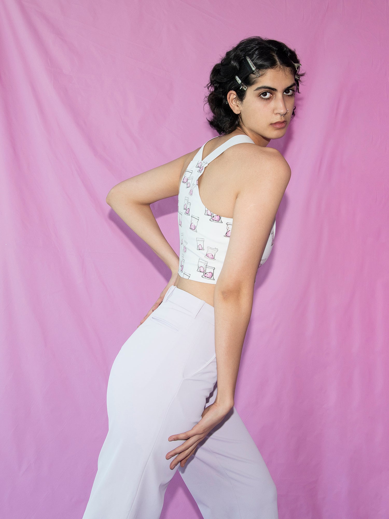 The iconic Tania George halter top with the Cotton Candy print. This top is made for both structure and comfort due to its fitted silhouette