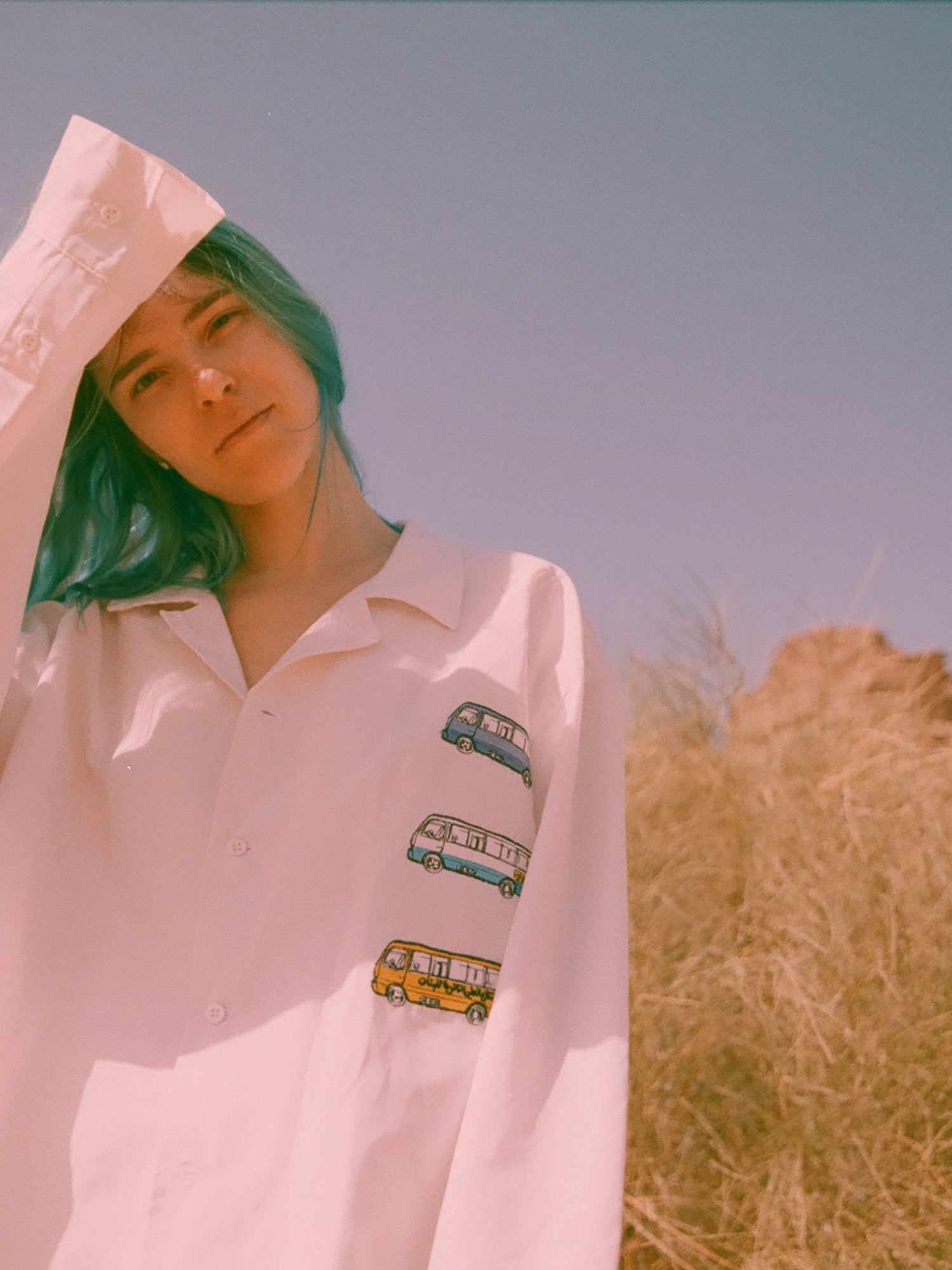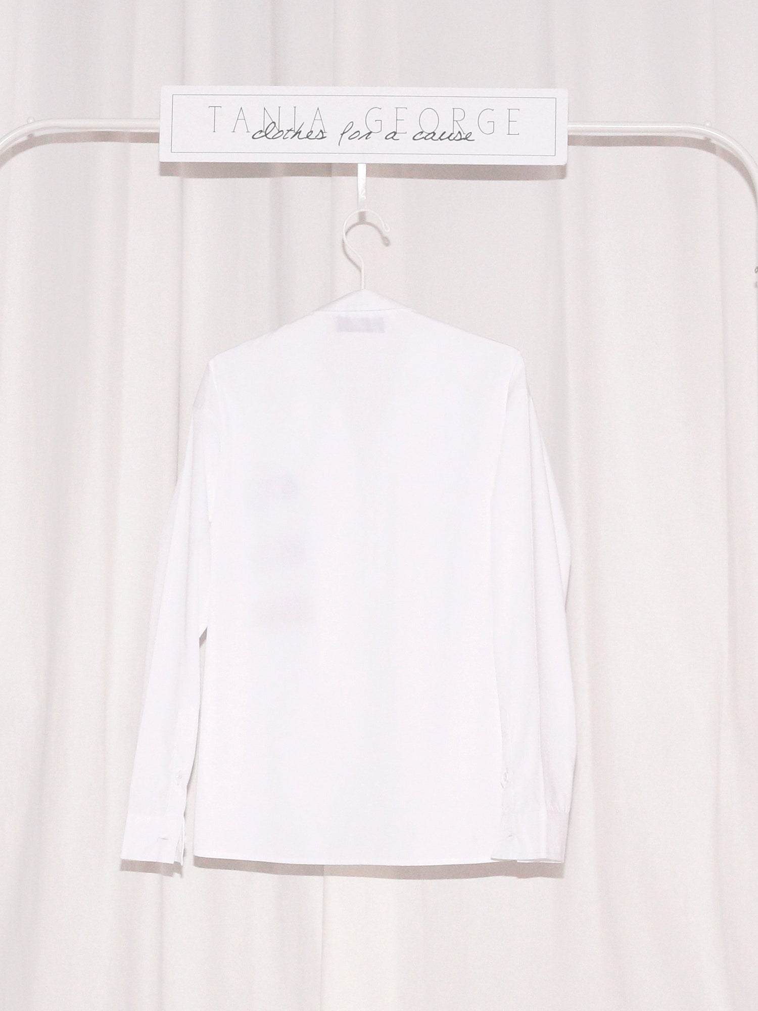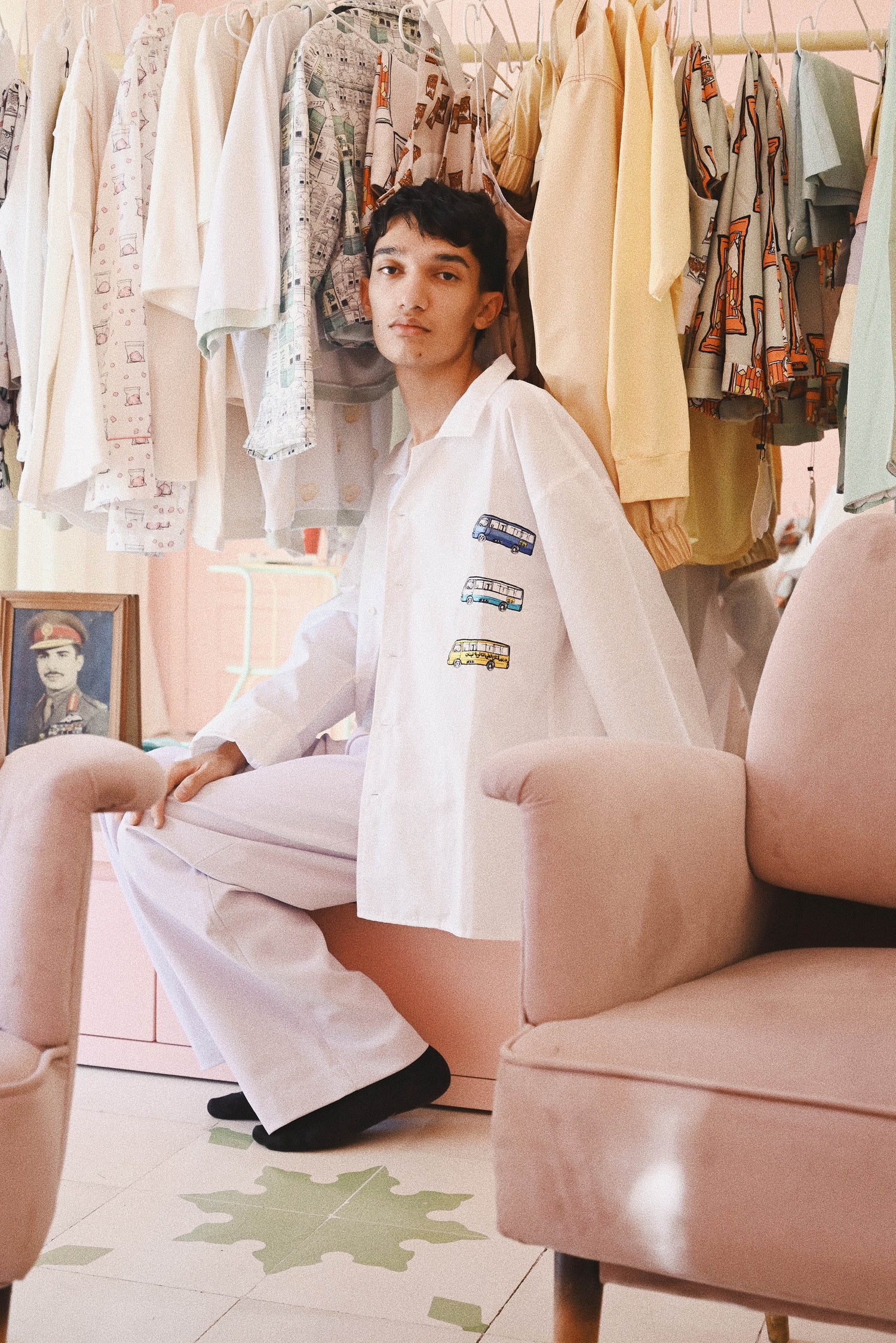 White shirt with the coasters print hand embroidered done by the traditionally skilled tailors of Amman