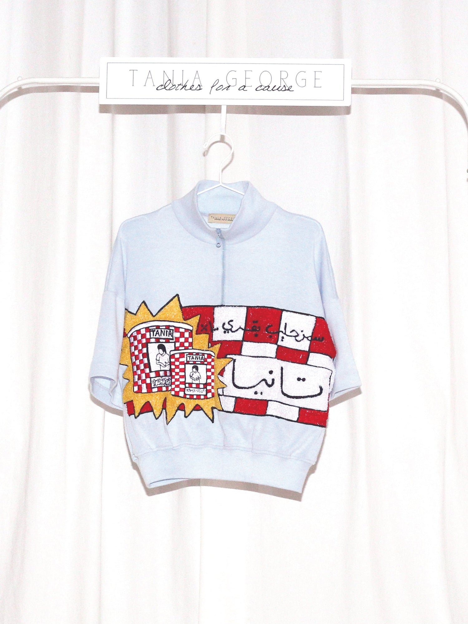 Short sleeved zip up shirt with the Tania ghee print hand embriodered by the traditionally skilled tailors of Amman