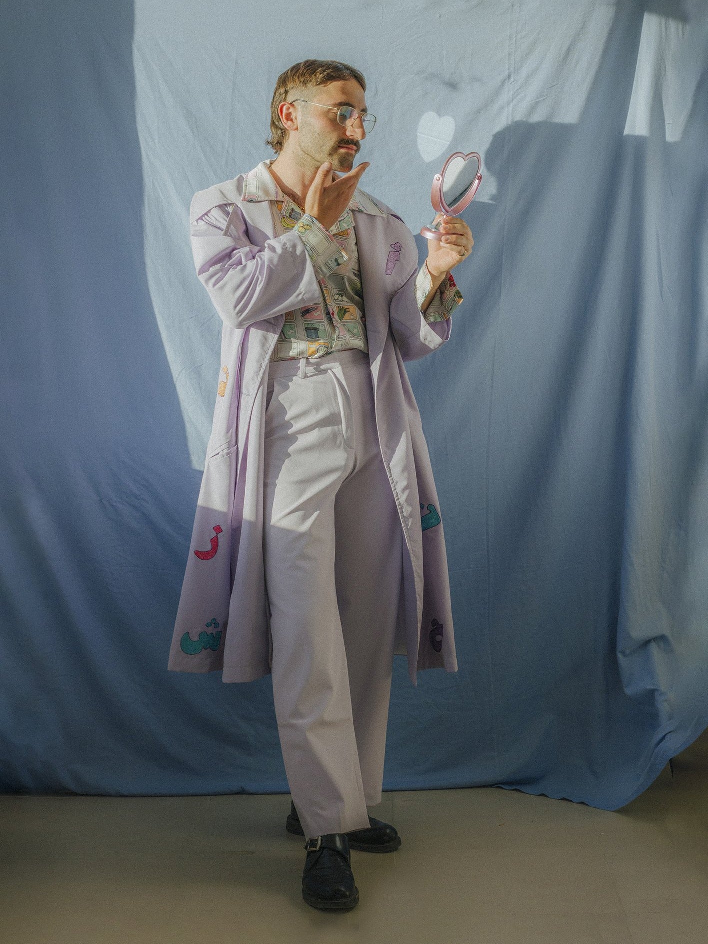 Embriodered long oversized coat with Arabic alphabets scattered all over done by the traditionally skilled tailors in Amman.