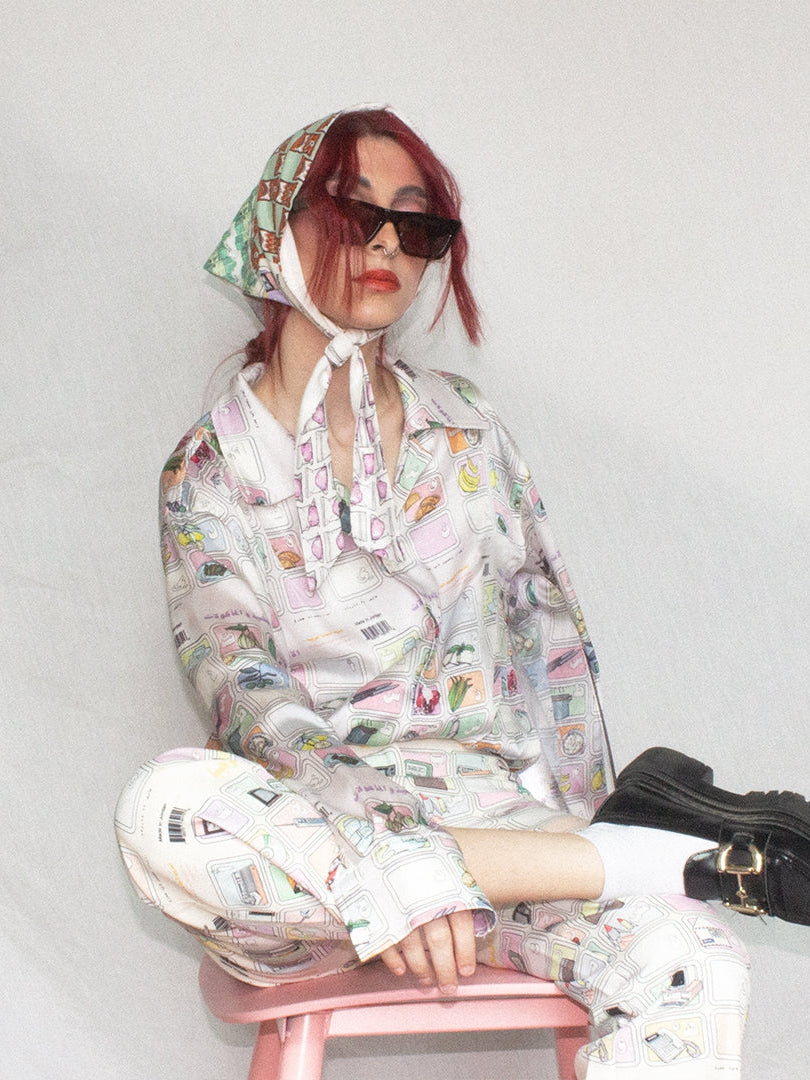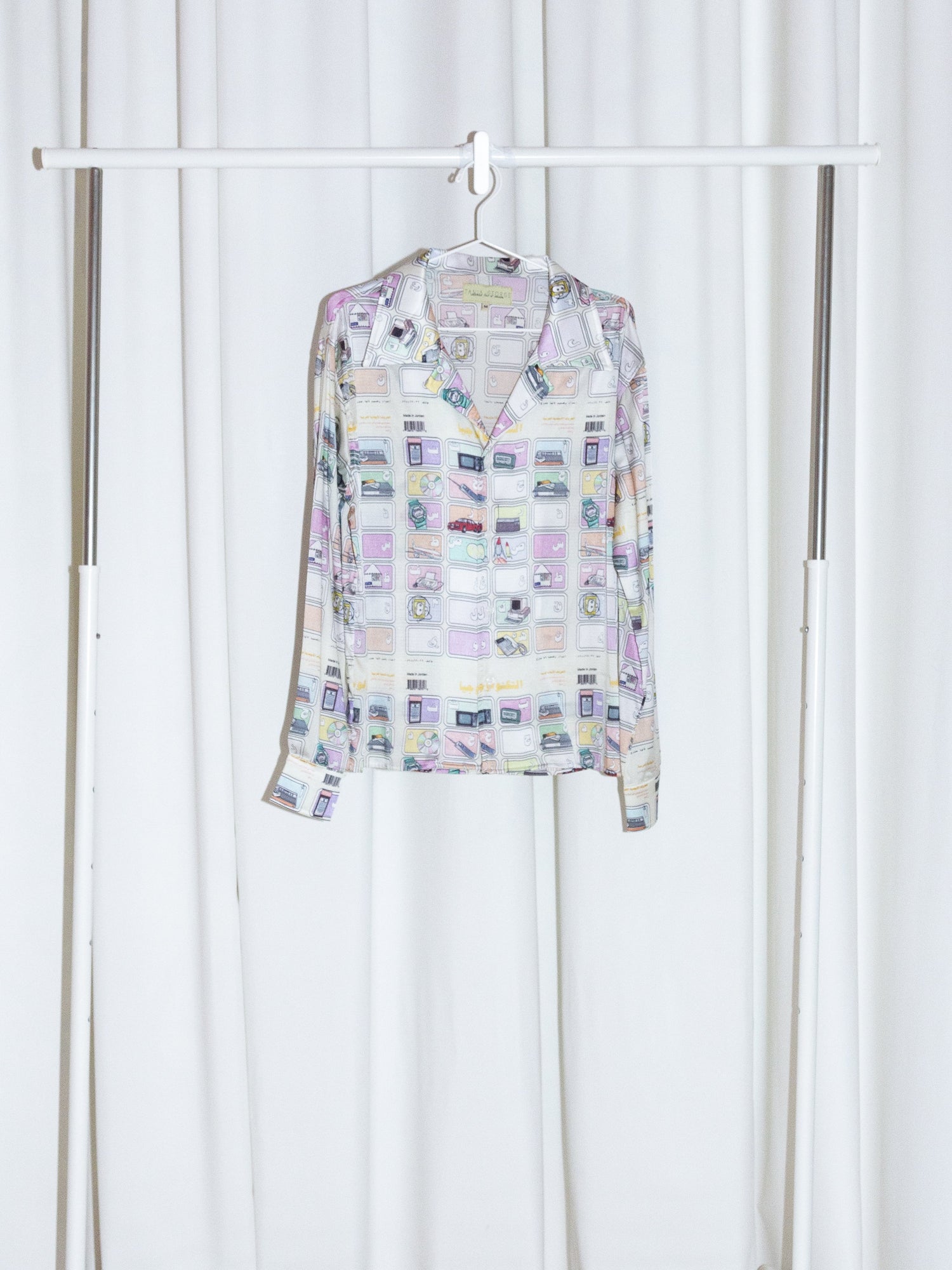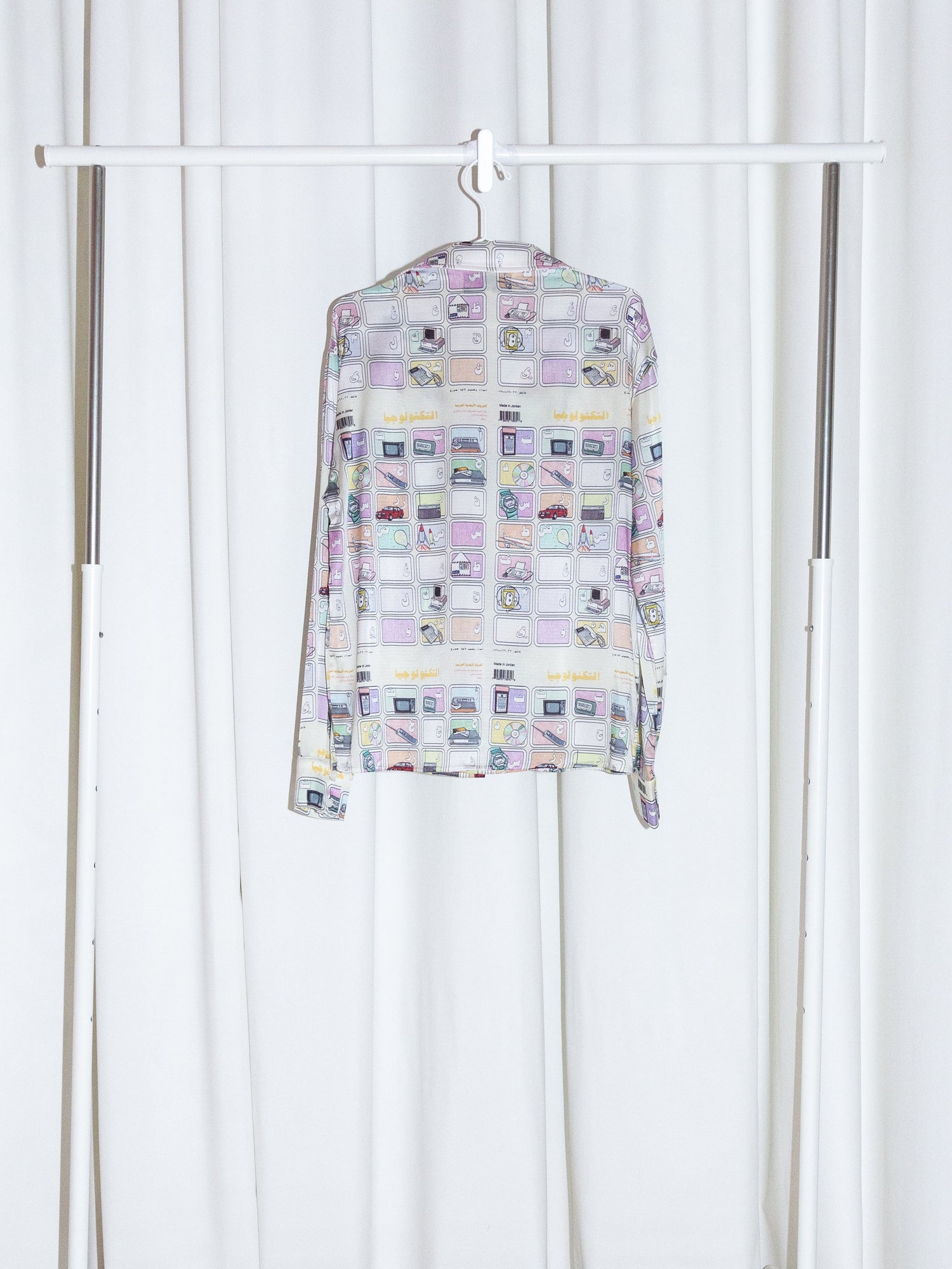 Face your adult life responsibilities with the power of your inner child. This silky wide collared shirt is decorated with the nostalgic Arabic alphabets all around.
