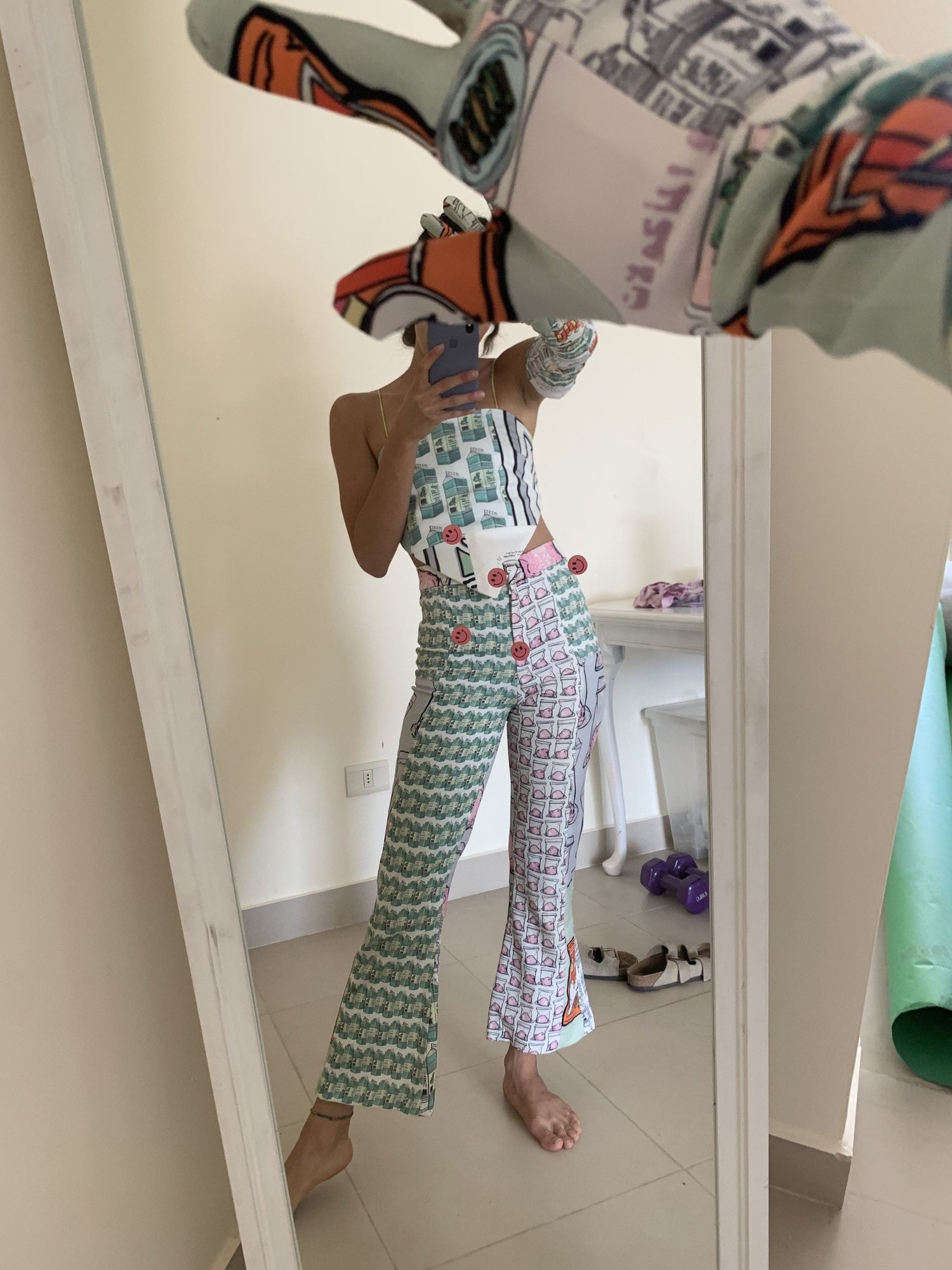 One of a kind fit and flare pants made with scrap fabric combining all previous collections. P.S. each piece will be different and may not appear exactly as the picture.